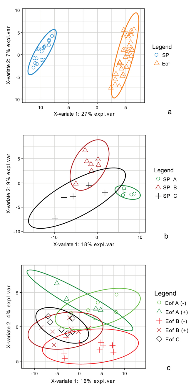 Discriminant analysis (s-PLS DA) was performed to identify the most discriminant OTUs between experimental groups. A first s-PLS DA in order to highlight the most discriminant OTUs was performed between SP and Eof point, independently of the probiotics supplementation Fig. (6a). The OTUs enabling to discriminate between these two groups were correlated to the OTUs affiliated to two Lachnospiraceae families (from the Clostridiales order and undetermined species) and to OTU_456 (affiliated to Enterococcus durans 100%). The second s-PLS DA was performed between the experimental groups at SP point Fig. (6b). Group B was the most separated group. The separation between these three groups was also correlated to 4 OTUs affiliated to Lachnospiraceae, 3 OTUs affiliated to Ruminococcaceae families (from the Clostridiales order and undetermined species) and to OTU_456 (affiliated to Enterococcus durans 100%). Finally, a third s-PLS DA was performed between the experimental groups at Eof point Fig. (6c). Groups A+ and B+ were the most variable groups. The separation between these two groups was correlated to 2 OTUs affiliated to Lachnospiraceae (undetermined species), 3 OTUs affiliated to Ruminococcaceae families (undetermined species) and to 3 OTUs affiliated to the Lactobacillus genus (OTU_400: L. curvatus 98.5%, OTU_44: L. vaginalis 100% and OTU_270: L. paralimentarius 99%). However, these OTUs are very minor (less than 0.05% of relative abundance).