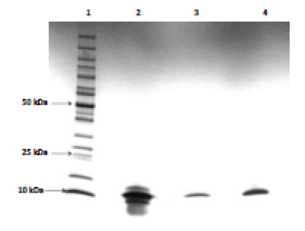 As shown in Fig. (2), HIV PR was successfully expressed as evident by a band size confirmation of 11 kDa (lane 9 and lane 10) and the absence of protease in the filtrate and supernatant confirms (lanes 4 to 8) that protease purification was successful. The abundance of protein present in lanes 2 and 3 is evidence of cell proteins extracted during the extraction of the inclusion body. Filtrate analysis indicated that the concentration of the protease was achieved. Furthermore, protease purified from E. coli grown in chemically defined medium (Lane 10) resulted in twice the amount of protease produced compared to E. coli grown in LB medium (Lane 9); which was further confirmed by protein determination (Table 2).