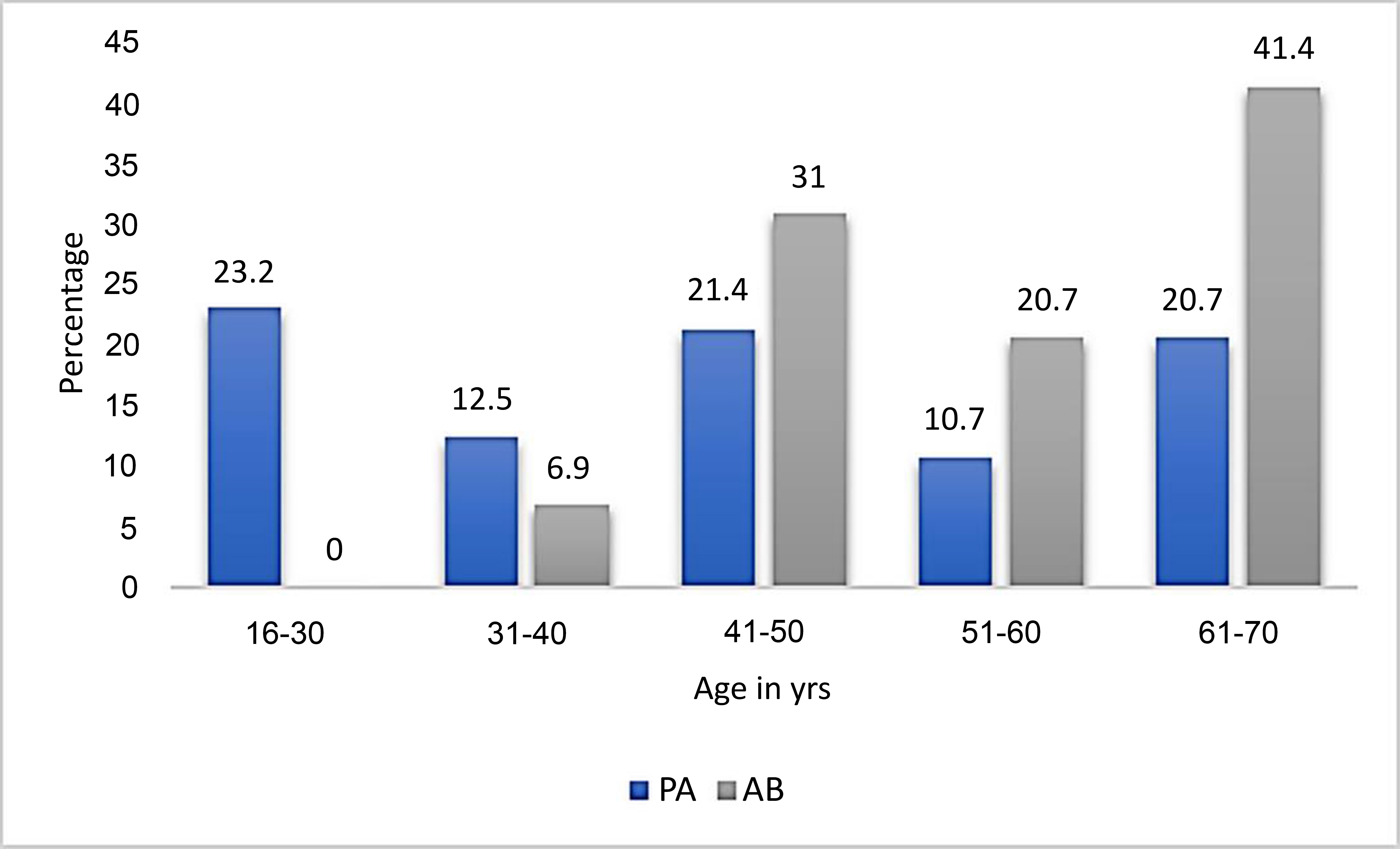 Out of 713 urine samples collected from female UTI patients, 665 (93.3%) yielded positive urine cultures. Among these, Pseudomonas aeruginosa was isolated in 56 cases (8.4%) and Acinetobacter baumannii in 29 cases (4.4%). The remaining isolates were predominantly Enterobacteriaceae (data not shown). The prevalence of P. aeruginosa and A. baumannii infections was highest among patients aged 41–50 years, followed by those aged 61–70 years, as illustrated in Fig. (1). The 16S rRNA gene sequences for representative P. aeruginosa (accession no. OQ363380) and A. baumannii (accession no. OQ363378) isolates were deposited in GenBank for reference. Among risk factors, only catheter use showed a statistically significant association (p < 0.05) with both species, suggesting it may be a significant risk factor for A. baumannii infections in our study (Table 2).