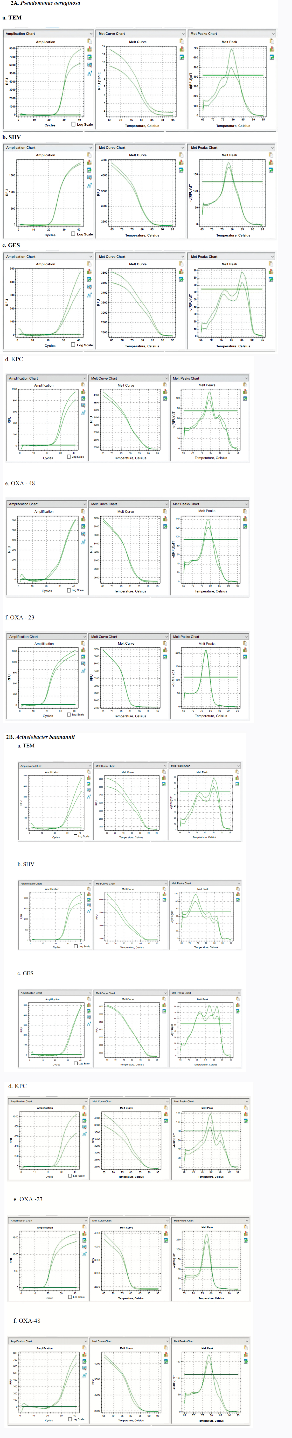 Genomic DNA was extracted from isolates using a commercial DNA extraction kit. Quantitative PCR was used to detect ESBL and Carbapenemase genes, including blaTEM, blaSHV, blaGES, blaKPC, blaOXA-23, blaOXA-48. The specific primer sets used for each gene are listed in Table 1. A loopful of bacterial isolates was suspended in 50 µL of ultrapure water.The suspension was centrifuged at 14000 rpm for 5 minutes, and the pellet was heated for 10 minutes at 95 °C to lyse the cells. The supernatant (30 µl) was collected and used as the DNA template for the reaction. qPCR was performed using the CFX96™ Real-Time PCR Detection System (Bio-Rad, USA). Each 20 µL reaction mixture contained 1 µL of DNA template, 0.8 µL each of forward and reverse primers (10 µM), 10 µL of 2× SYBR Green Master Mix (Bio-Rad), and nuclease-free water to make up the final volume. qPCR cycling conditions include Initial denaturation at 95 °C for 5 minutes, followed by 35 cycles of denaturation at 95 °C for 15 seconds and 60 °C for 30 seconds (combined annealing and extension), with fluorescence acquisition at the end of each cycle. A melt curve analysis was performed at the end of the run to confirm amplification specificity. qPCR was used to detect the presence or absence of the genes, and also ct values are qualitatively interpreted. All reactions were run in triplicate to ensure consistency and produce reliability of results. Klebsiella pneumoniae ATCC 700603 was used as a positive control for blaSHV, and for other genes, standard lab controls were used. Amplified products were visualized using gel electrophoresis, and melt curve analysis was performed to confirm gene specificity (Fig. S2).