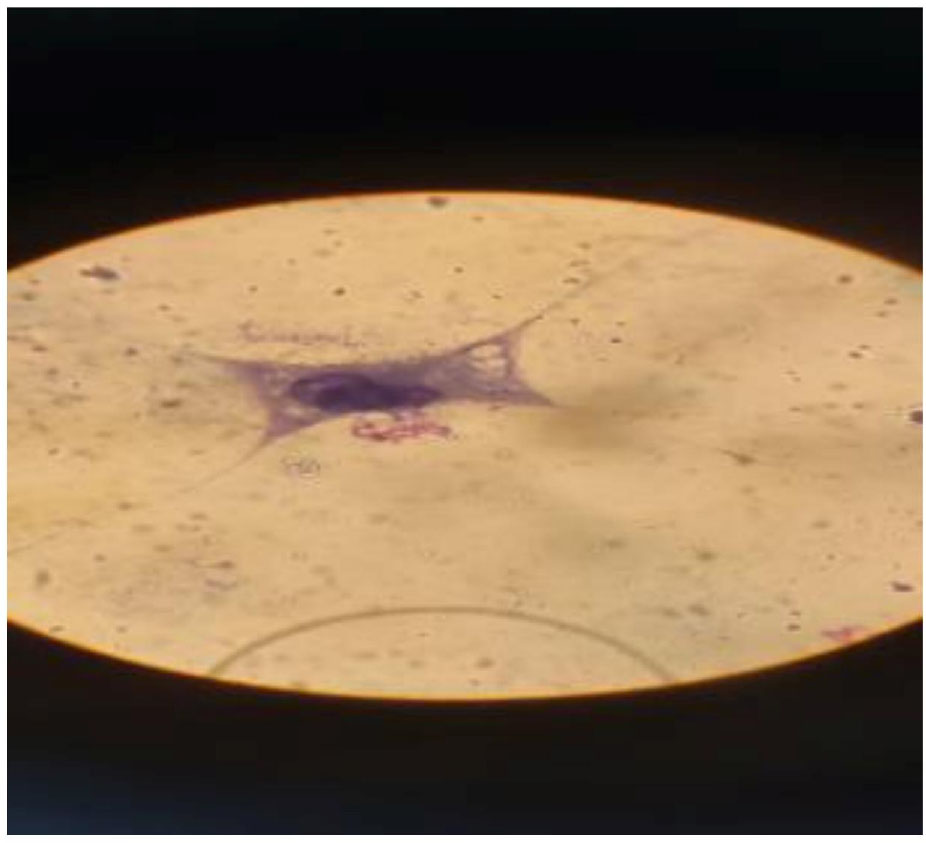 Infected and intact cells in HeLa cells in cell culture by microscope 100X.