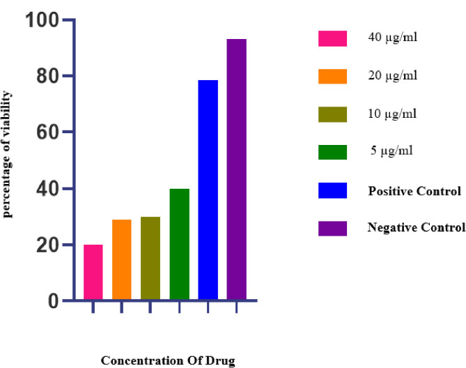 The survival percentage at the different concentrations of linezolid in uninfected HeLa cells 24 hours after culture is shown in Fig. (5). No statistically significant difference was observed between the treated and control groups (p=0.099). Since the p-value is greater than 0.05, the difference between the drug-treated and control groups is not statistically significant.