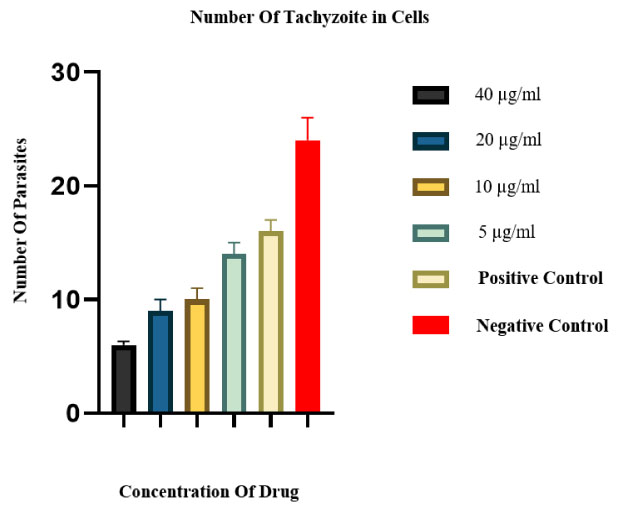 The results from cell culture showed that at higher concentrations of linezolid, the number of tachyzoites decreased (Fig. 6). In addition, HeLa cells were viable in the culture media, which could be seen under the microscope (Fig. 6). The percentage of parasite-infected cells 24 h after drug exposure compared to the control groups is demonstrated in Fig. (7). Additionally, the mean and standard deviation of tachyzoite counts in treated and control cells after 24 h are illustrated in Fig. (8).