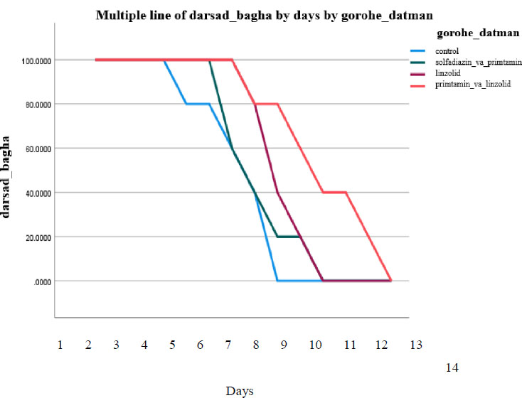 In this study, female BALB/c miceaged 6-8 weeks and weighing 20-25g were categorized into four groups (n = 5 mice in each group).Animals were housed in standard aluminum cages in the laboratory at a temperature of 20-23°C and a 12-hour light-dark cycle. All groups were injected subcutaneously with 1×103T. gondii tachyzoites to induce infection. The experimental groups included: The mice received no treatment (control group), sulfadiazine +pyrimethamine (group II), linezolid (group III), and pyrimethamine+linezolid (group IV). The treatment consisted of 5 injections of the drugs, one day apart, as follows: control group (the mice received no treatment), sulfadiazine +pyrimethamine 100 μl of pyrimethamine (2 mg/kg/day) and sulfadiazine (40 mg/kg/day), linezolid (100 μl of 25 mg/kg/day), and pyrimethamine+linezolid (100 μl of 0.2µg/ml) injected intraperitonially for 14 days. The survival periods of all mice were monitored daily. The significant differences in survival rate were evaluated by the Kaplan–Meier test.