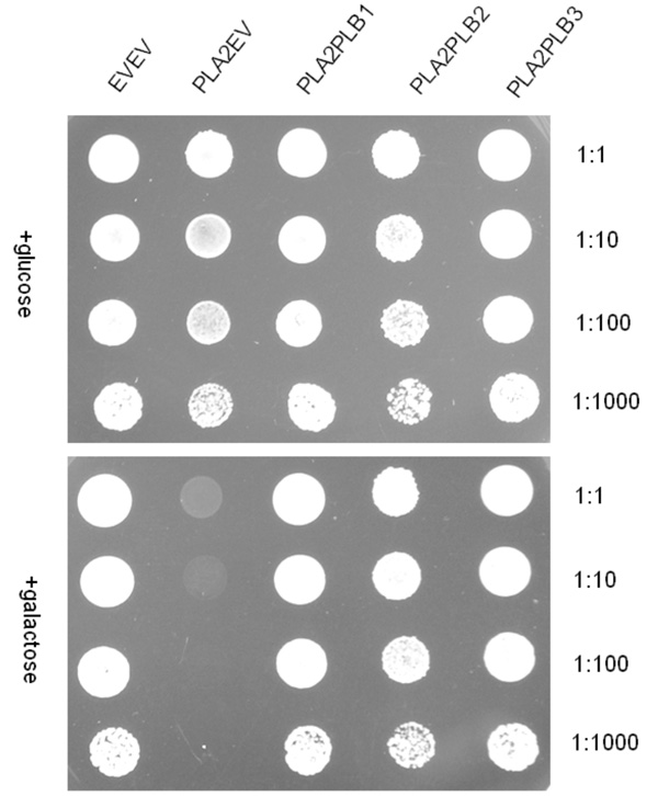Cell growth of Wild type empty vector (WTEV), wild type PLA2 (WTPLA2), plb123 empty vector (plbEV) and plb123 PLA2 (plbPLA2) transformants (as designated in Table 1) on medium supplemented with glucose or galactose. All strains were cultured to stationary phase in SC medium with glucose and adjusted to OD600 of 3.0 as a starting cell density; Cells were also diluted 10, 100 and 1000 times and 10 μl of each was spotted on a plate with medium as indicated and incubated for three days.