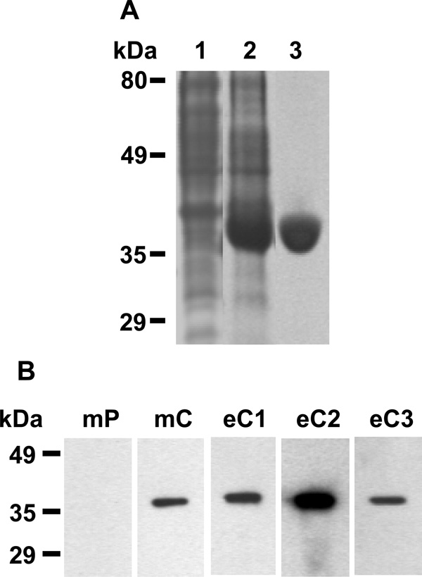 Recombinant SeMac and evidence for in vivo production of SeMac. (A) SDS-PAGE analysis of recombinant SeMac. Lanes: 1, E. coli lysate without SeMac (control); 2, E. coli lysate containing overexpressed SeMac; 3, purified SeMac. (B) Western immunoblot analysis of SeMac with SeMac antibody present in the convalescent-phase sera from 3 horses with S. equi infection (eC1, eC2, eC3) and mice before (mP) and after (mC) experimental S. equi infection.