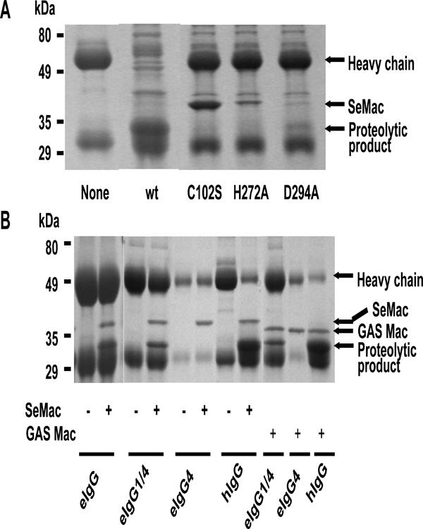 IgG endopeptidase activity of SeMac. (A) IgG-endopeptidase activity and critical amino acid residues for activity. Human IgG was incubated without (none) or with E. coli lysate containing wild-type SeMac (wt), SeMacCys102Ser (C102S), Se- MacHis272Ala, or SeMacAsp294Ala at room temperature for 60 min and analyzed by SDS-PAGE. (B) Limited cleavage of horse IgG by SeMac and GAS Mac. Horse total IgG (eIgG), IgG4 (eIgG4), IgG1/IgG4 mixture (eIgG1/4), or human IgG was incubated with purified SeMac or GAS M1 Mac and analyzed by SDS-PAGE.