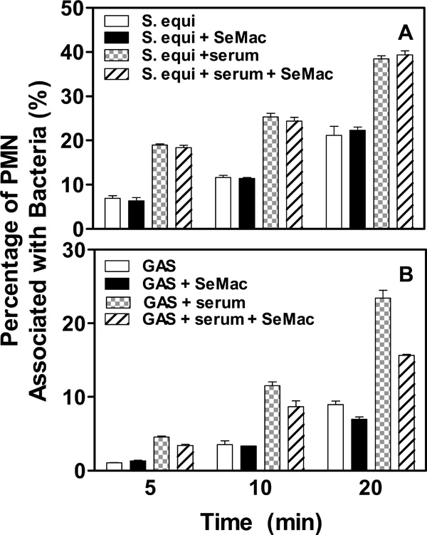 Effects of SeMac on opsonophagocytosis of S. equi and GAS by horse (A) and human (B) PMNs, respectively. FITC-labeled S. equi and GAS bacteria (107 c.f.u.) were treated without or with horse and human convalescent sera and incubated in the presence or absence of 100 µg/ml SeMac with 100 µl nonimmune horse and human blood, respectively, at 37°C for 5, 10 or 20 min. Red blood cells were lysed using an Immunolyse kit, and percentages of PMNs with phagocytosed bacteria determined by flow cytometry are presented.