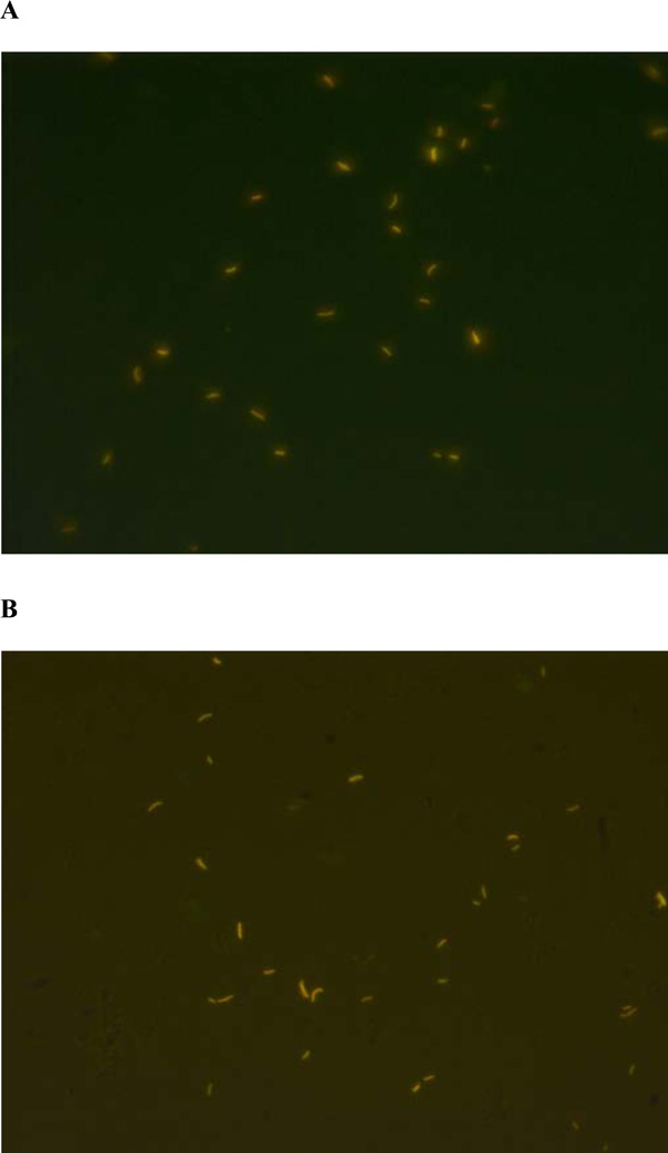 (A). AFB stained using QBC ParaLens™ system, Auramine-O/Rhodamine B (Truant’s Modification) (60x ParaLens objective w/oil, Olympus CH40 compound microscope). (B). AFB stained using conventional fluorescent microscope, Auramine-O/Rhodamine B (Truant’s Modification) (x40 Uplan objective, Olympus BX51 Fluorescent Microscope).