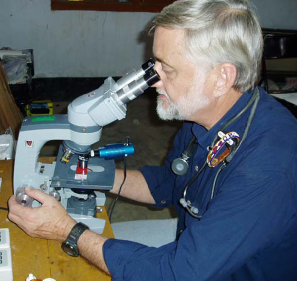 The QBC ParaLens™ attachment in use by the author (WK) in a rural clinic in Bangladesh.