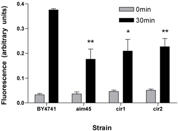 Mutants affected in genes encoding ETF and ETF-dH display decreased intracellular oxidation upon heat shock. Cells of the parental strain (BY4741) and of mutants affected in AIM45(aim45), YGR207c/CIR1 (cir1) and YOR356w/CIR2 (cir2) were loaded with the oxidant-sensitive fluorescent probe 2’,7’-dichlorodihydrofluorescein diacetate and exposed to 50ºC for 30min. Fluorescence was recorded in each cell lysate and compared to loaded cells without exposition to 50ºC. *P < 0.05 and **P < 0.01 when compared with strain BY4741 with the same time incubation..