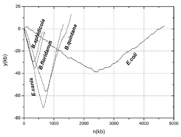 In Fig. (2), y component curves are shown for four representatives of 11 obligate intracellular bacteria. For convenient observation, the other 7 bacteria are not shown but they have similar y component curves. For comparison, y component curve of E. coli K12 chromosome is also shown. In E. coli, there also exists strand specific composition bias, whereas it is not strong enough to generate separate codon usages. From this figure, we could make the following two observations. Firstly, changing rates of y component curves for the four representative obligate intracellular bacteria are much higher than that of the free-living E. coli. According to equation (1), the y component curve represents the cumulative excess of G over C plus T over A. Therefore, comparison between y component curves of the two groups of bacteria suggests that 11 obligate intracellular bacteria have stronger strand composition bias. Secondly, all of the y component curves for four bacteria are much smoother than that of E. coli. In y component curve for the latter, there are many prickles along the chromosome, whereas not so many for the former. As shown in Grigoriev [18], prickles in the chromosome diagrams usually denote sequence inversions or direct translocations to another half of a chromosome, or integration of foreign DNA into the chromosome. In other words, chromosome rearrangements usually are exhibited as little prickles in the y component curves. Therefore, we could make the conclusion that the 11 obligate intracellular chromosomes are highly stable and have very few rearrangements. As suggested by Rocha [7] and others, stronger strand composition bias and lower rearrangements frequency are just the most likely reasons for the appearance of separate base/codon usages in some obligate intracellular bacteria. Our results confirmed their speculations.