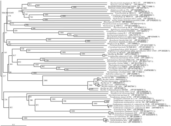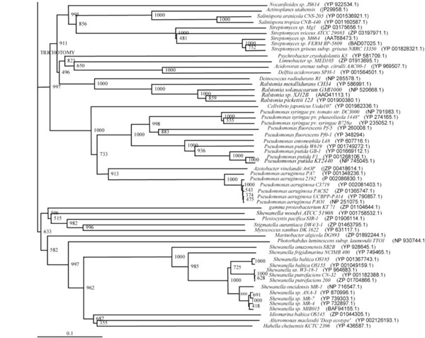 Phylogenetic tree (Lower half) based on protein sequences of organisms containing conserved domains with respect to Ralstonia sp. XJ12B AHL acylase as reference (For Taxonomic details refer to Additional file 3). A Neighbor-Joining analysis with Jukes-Cantor correction and bootstrap support was performed on the protein sequences. Bootstrap values are given at nodes, 1000 bootstrap replicates were run. The leaf contains Accession number and name of the organism.