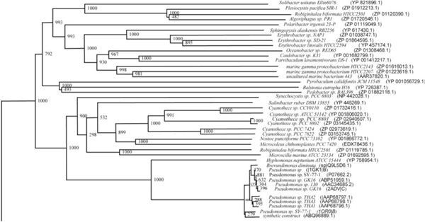Phylogenetic tree (Lower half) based on protein sequences of organisms containing conserved domains with respect to Bacillus sp. SB4 AHL lactonase as reference (For Taxonomic details refer to Additional file 3). A Neighbor-Joining analysis with Jukes-Cantor correction and bootstrap support was performed on the protein sequences. Bootstrap values are given at nodes, 1000 bootstrap replicates were run. The leaf contains Accession number and name of the organism.