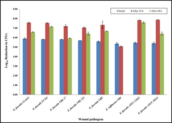 Prolonged incubation up to 48 hours showing the antibacterial properties of the bioelectric wound dressing against Enterococcus clinical wound isolates. Data reported are the average values of three independent assays. The results are shown as means the standard error on the mean of three experiments.