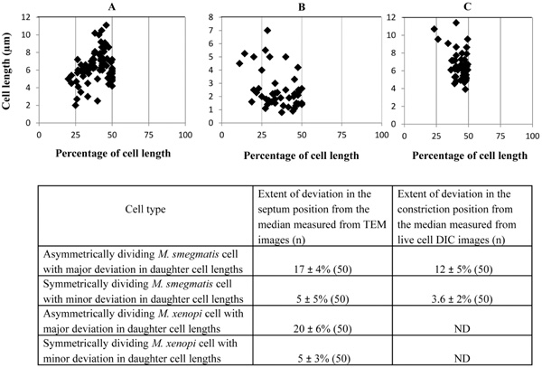 Using transmission and scanning electron microscopy (TEM and SEM), a large number of cells in the mid-log phase population were first screened for the presence of cells with division site position deviated more than that shown by the majority of the cells in the population. The position of the division site (septum/constriction), when deviated by more than 10% from the mid-cell site, irrespective of the sizes of the mother cells, was considered highly deviated asymmetric division in our studies. This higher cut-off was set up in order to differentiate the major deviation in the asymmetric septum/constriction position of the cells in the minority population from the minor 5-10% deviation in the symmetric division of the cells in the majority population (80% of septating cells) of mycobacteria, reported recently [2-4].