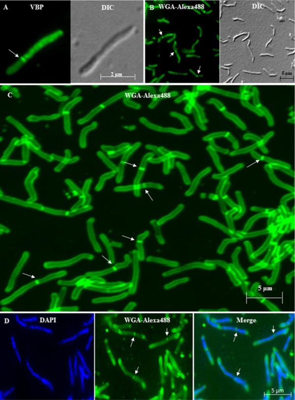 Vancomycin-BODIPY (VBP) was used to stain the septum of live cells, as described [9-11]. One µg/ml of VBP (in PBS) was added to the cells and incubated with shaking at 170 rpm for 3 hrs at 37°C. The cells were then adhered to poly-L-lysine coated slides for observation under Zeiss AXIO Imager M1 microscope. For staining with WGA-Alexa488 (2 µg/ml in 1x PBS) [12], the cells were fixed in 4% para formaldehyde, adhered to poly-L-lysine coated slides, washed with 1x PBS for 1 min, treated with lysozyme (2 mg/ml) for 15 min, washed thrice with 1x PBS for 1 min each, stained for 15 min, mounted on 90% glycerol, and observed. DAPI staining for nucleoid was performed using 0.5 µg/ml of DAPI in 1x PBS with 0.1% Triton-X100 for 5 min, and washed thrice with 1x PBS for 1 min each time. The cells were mounted in 90% glycerol and observed. A large number of septum-stained cells were analysed using fluorescence microscopy (FM).