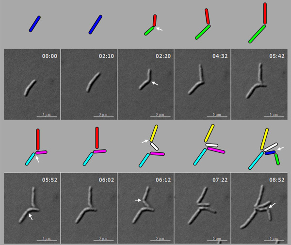 The lineage of the growth and highly deviated asymmetric division of live M. smegmatis cell and of its daughter cells, shown in Fig. (4). The growth and division lineage was traced from the images of time-lapse microscopy in Fig. (4). The zero time point does not correlate with the birth of the starting mother cell.