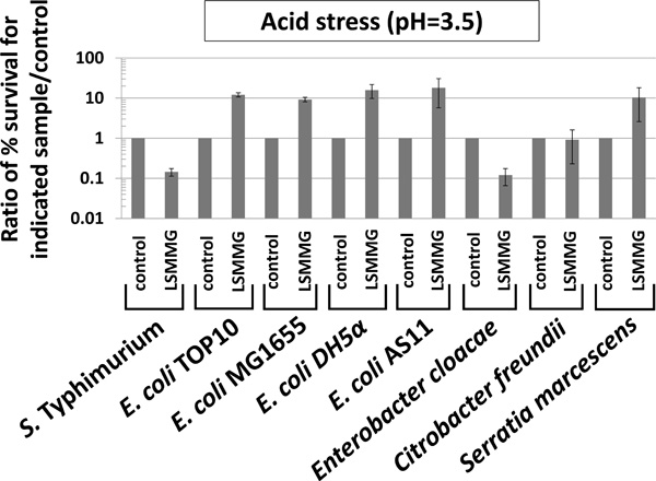 LSMMG-mediated alteration of acid stress resistance in Enterobacteriaceae. The indicated strains were grown in the RWV in the LSMMG and control conditions for testing of acid stress resistance (pH=3.5, citric acid, 2 hours stress exposure) as previously described [3, 7]. To test survival of the stress in the LSMMG and control samples, aliquots from each sample were removed from the stress, serially-diluted in PBS, and plated for CFU counts on LB media. The percent survival of the bacteria compared to the number present at t=0 before addition of the stress was determined for each sample, and then a ratio of percent survival values was calculated and plotted as indicated in the graph (either control/control or LSMMG/control). The data was obtained from at least three independent experiments each plated in triplicate, and the average and standard deviation are plotted. The differences between LSMMG and control were significant at p-value < 0.05.