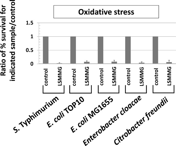 Oxidative stress resistance altered by LSMMG in Enterobacteriaceae. RWV cultures of the indicated strains were tested for oxidative stress resistance (hydrogen peroxide, 35 - 70 mM, 2 hours stress exposure) as described in Fig. (3) and as previously described [4, 33] The data was obtained from at least three independent experiments each plated in triplicate, and the average and standard deviation are plotted. The differences between LSMMG and control were significant at p-value < 0.05.