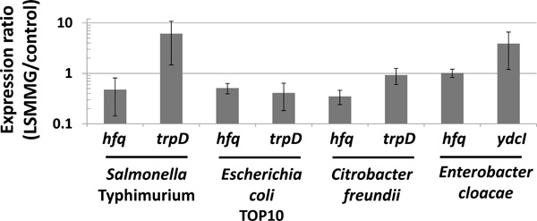 qRT-PCR analysis to determine LSMMG-induced alterations of gene expression in Enterobacteriaceae. Total RNA harvested from LSMMG and control cultures was converted to single-stranded cDNA and used as template in qPCR analysis with primers hybridizing to the indicated genes as described previously [3, 18]. PCR product levels were normalized to both the 16S rRNA and lpxC genes [3, 34], and a ratio of each gene level for LSMMG to control was calculated to give a fold-difference in expression between the two samples as previously described [3]. Differences in expression between LSMMG and control samples were significant at p-value < 0.05. The data was obtained from at least four qPCR reactions using RNA from at least two independent cultures for each condition, and the data is plotted as the average and standard deviation.