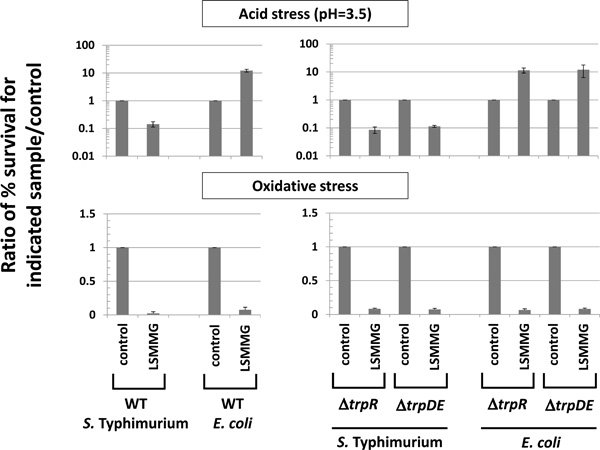 Analysis of role of trp genes in LSMMG phenotypes. S. Typhimurium and E.coli Δ trpR and Δ trpDE strains were compared to respective WT strains for LSMMG-mediated alteration of acid and oxidative stress as described in Figs. (3, 4). The data was obtained from at least three independent experiments each plated in triplicate, and the average and standard deviation are plotted. The differences between LSMMG and control were significant at p-value < 0.05.