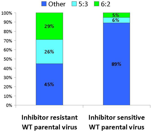 The difficulties encountered in generating current LAIV reassortant viruses led us to perform a large-scale analysis of reassortment efficiency. We found that the rate of NA inheritance by reassortant viruses depended on the inhibitor sensitivity of the WT parental virus to normal guinea pig serum regardless of its specific type/subtype, with the exception of subtype H5N1 viruses. Table 2 shows the distribution of reassortants bearing NA gene segments from WT or cold-adapted parental viruses stratified by the inhibitor sensitivity of WT parental viruses. In fact, over 80% of all reassortants based on inhibitor-resistant WT viruses (297 out of 356) inherited WT NA, compared to only ~26% of reassortants based on inhibitor-sensitive WT viruses (130 out of 493; Fig. 1). The rate of WT NA inheritance by influenza virus reassortants of various types/subtypes varied, but generally was significantly higher when parental viruses were inhibitor-resistant (Table 3).
